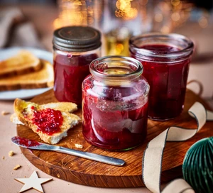 Put the cranberries and apple pieces in a large, heavy-based pan. Add the orange zest and juice along with the ginger, cinnamon and cloves. Cover the pan with a well-fitting lid and set over a low heat. Cook for 10 mins, swirling the pan from time to time, but not stirring. Remove the lid and add the sugar, stirring with a wooden spoon until the sugar has fully dissolved. Bring to a rolling boil and cook for about 10 mins. If you have a jam thermometer, the mixture should reach 104C. Alternatively, remove the pan from the heat and spoon a little of the jam onto one of the chilled plates. Leave for 1-2 mins, then push the jam gently with a fingertip to see if it has set enough to wrinkle. If it doesn’t, continue to boil for a few more minutes then test again. Remove from the heat and stir in the butter. Let stand for 10 mins before pouring it into the sterilised jars. Seal and label.